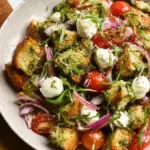 Ein köstlicher Bärlauch Brotsalat mit knusprigem Brot, bunte Cocktailtomaten und cremigem Mozzarella, vereint in einem aromatischen Dressing.