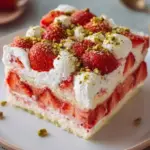 Stellen Sie sich vor, Sie sitzen an einem warmen Sommertag im Freien, umgeben von Freunden und Familie. Plötzlich kommt ein Tablett mit diesem cremigen Erdbeer-Dessert. Die strahlenden Farben der Erdbeeren, die verführerische Creme und der Hauch von Pistazien ziehen sofort alle Blicke auf sich. Doch es ist der Geschmack, der Ihnen den Atem raubt. Es ist der perfekte Mix aus süß und leicht sauer, das samtige Gefühl in Ihrem Mund, das Ihnen das Gefühl von purer Freude vermittelt.