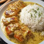 Ein köstliches Honig Senf Hähnchen, zart und umhüllt von einer cremigen Sauce, perfekt serviert mit fluffigem Reis.