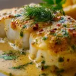 Zarter Kabeljau in einer cremigen Senfsoße, ideal für ein schnelles und festliches Abendessen.