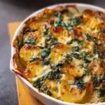 Köstliches Kartoffel Spinat Gratin mit geschmolzenem Käse und frischem Spinat