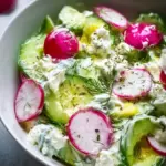 Ein erfrischender und knackiger Salat mit Radieschen, Gurken und Hüttenkäse, ideal für den Frühling und Sommer.