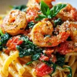 Eine köstliche und gesunde Pasta mit Garnelen, frischen Tomaten und Spinat, perfekt für Wochentage oder besondere Anlässe.