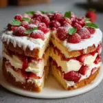 11. Wiederholen: Wiederholen Sie den Vorgang mit der restlichen Sahne und den Erdbeeren und dekorieren Sie den Kuchen nach Belieben mit frischen Minzblättern und zusätzlichen Erdbeeren.
